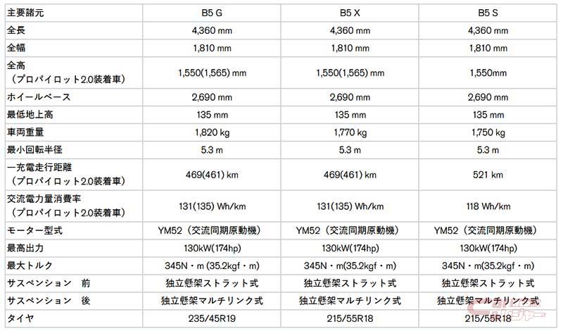 今回新たに発表したB5グレードでは、ベースとなる3代目リーフの広々とした室内空間、EVならではの力強く静かな走行性能、先進の運転支援技術の採用などの魅力を継承しつつ、55kWhのバッテリーを搭載したモデル。
