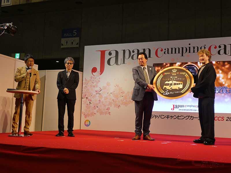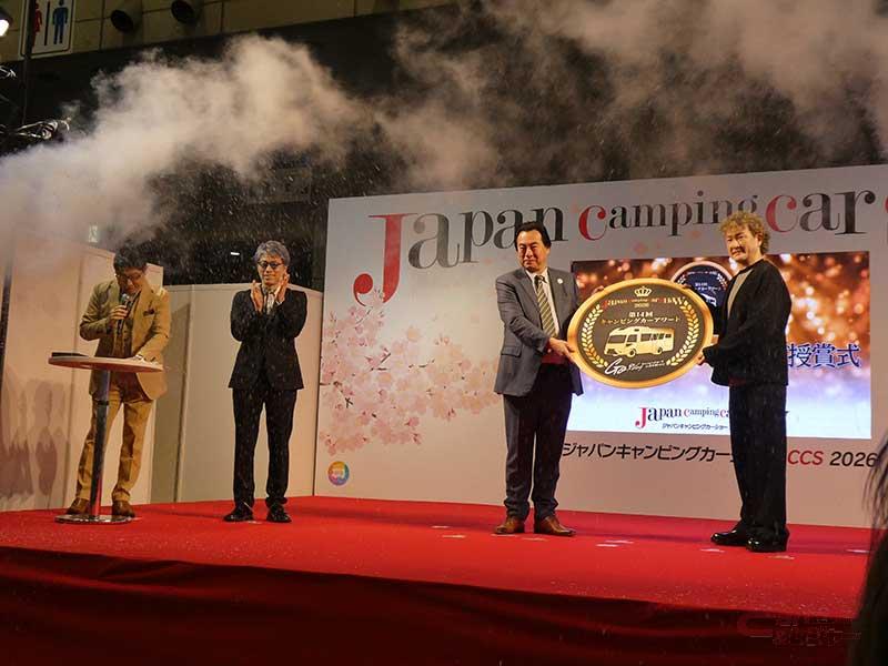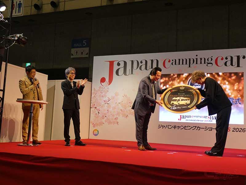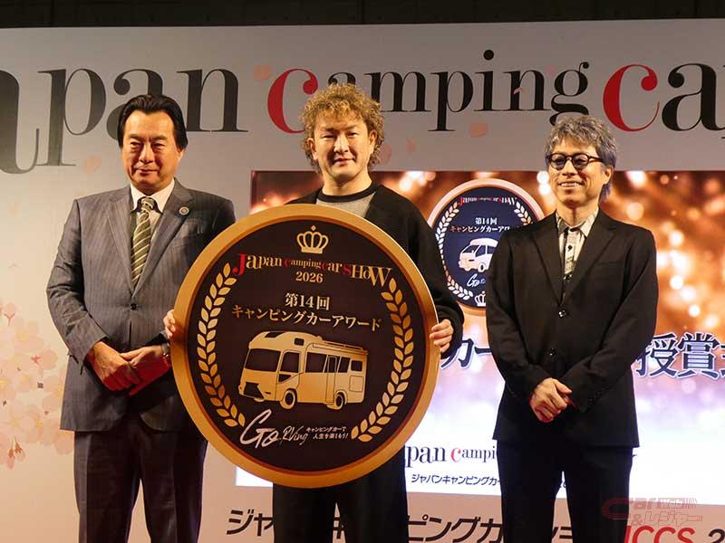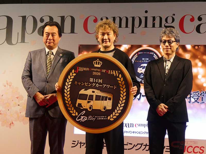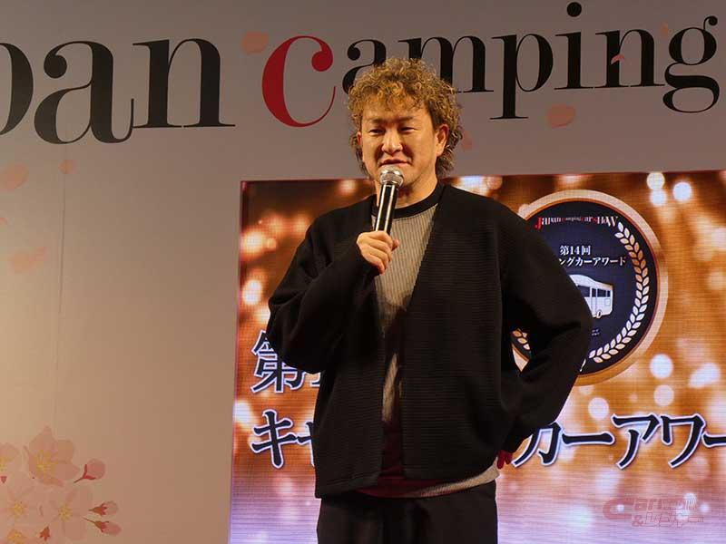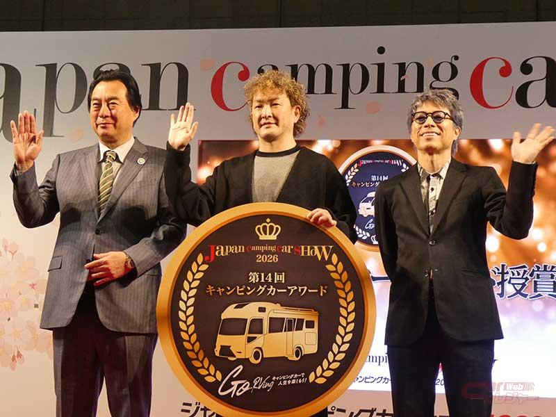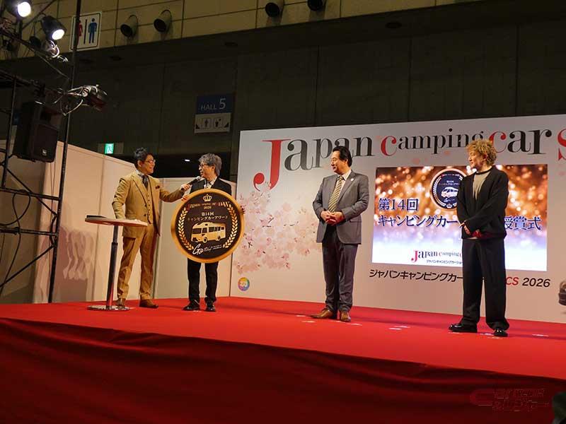 1月30日に行われた第14回キャンピングカーアワードの授賞式には、中村獅童さん・田村淳さん(ロンドンブーツ1号2号) が登壇し、中村獅童さんが選ばれた理由や、田村淳氏による最新のキャンプ事情についてのトークなど、会場は大きな盛り上がりを見せた。