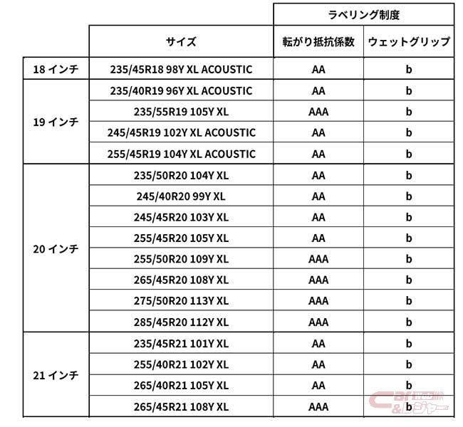 スポーツセグメントにおいて低燃費性能の最高等級である「AAA」( JATMAによる低燃費タイヤ等のラベリング制度によるグレード)を取得したサイズを展開しているのが特長で、これにより、燃費の向上や、電気自動車(BEV)走行可能距離の大幅向上を実現。