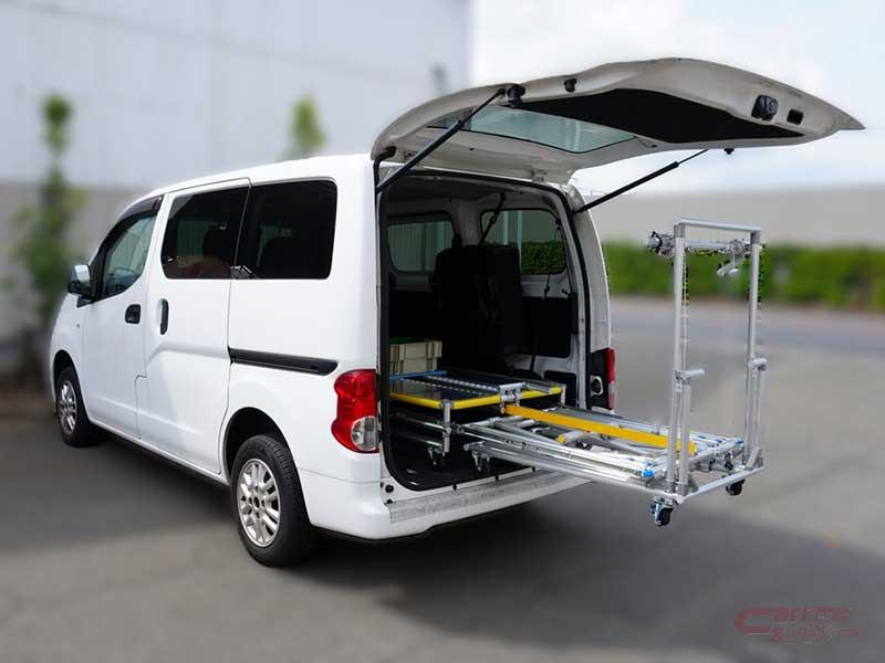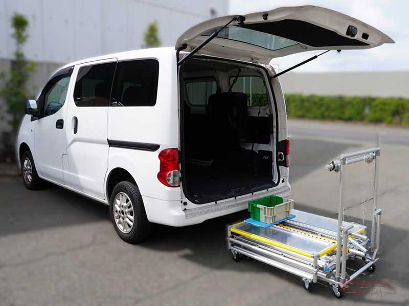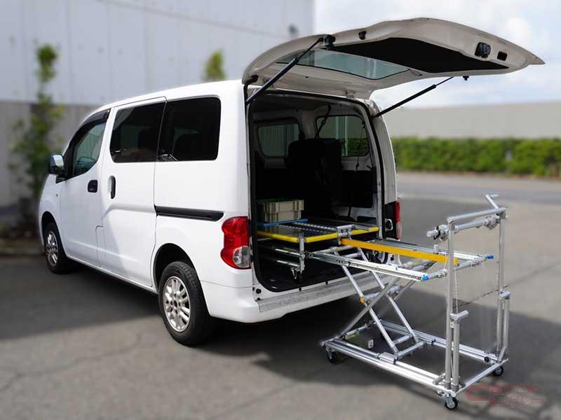 - 荷台を昇降、スライド、傾けることで、荷物の載せ降ろし作業の回数を低減したり、荷物を積んだまま台車を車へ積載したりすることを可能とする技術