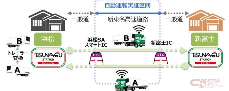 今回の公道実証走行では、高速道路上における安全かつ安定的な無人走行技術の確立を主な目的とし、新東名高速道路 新富士ICから新東名高速道路 浜松SAスマートICまでの区間において、ロボトラックが技術開発した自動運転セミトレーラーの公道実証走行を実施する他、発着地として設定する「TSUNAGU STATION」では、中継輸送を想定したトレーラー交換による物流効率化の検証を行う。