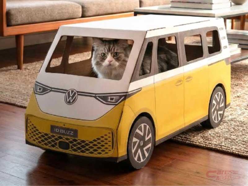 - フォルクスワーゲンのアイコン的モデルである「ID. Buzz」を模した、猫が乗れる特製の「ID. Buzz 特製ダンボールカー」 選考で選ばれた3匹の「VWにゃんバサダー」にプレゼント。