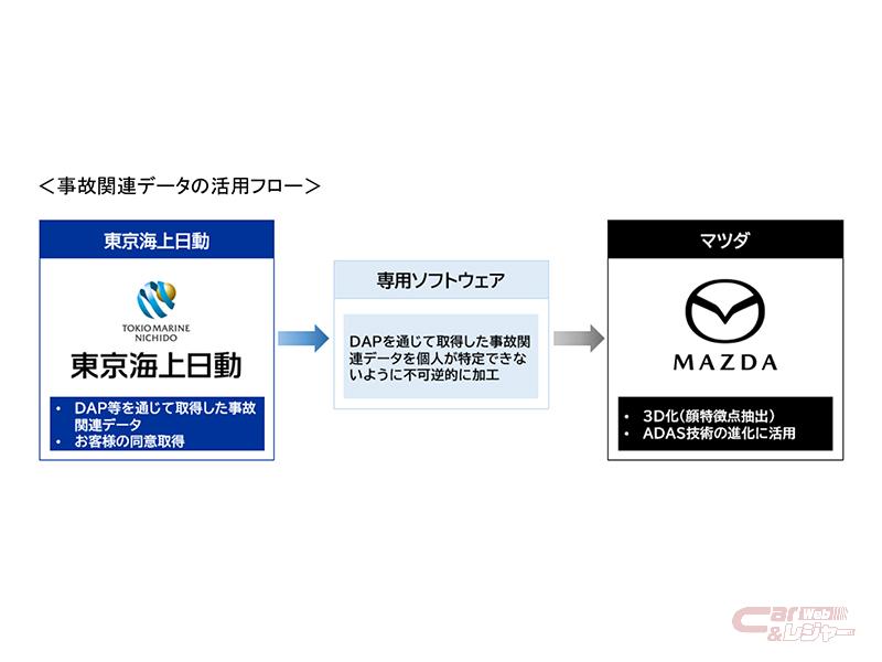 マツダと東京海上日動火災保険株式会社(以下「東京海上日動」)の2社は3月23日、東京海上日動が保有する事故関連データをマツダの車両安全性能向上を目的とした研究・開発に提供し、マツダのADAS 技術(先進運転支援システム)の進化に向けた取り組みを開始したと発表した。